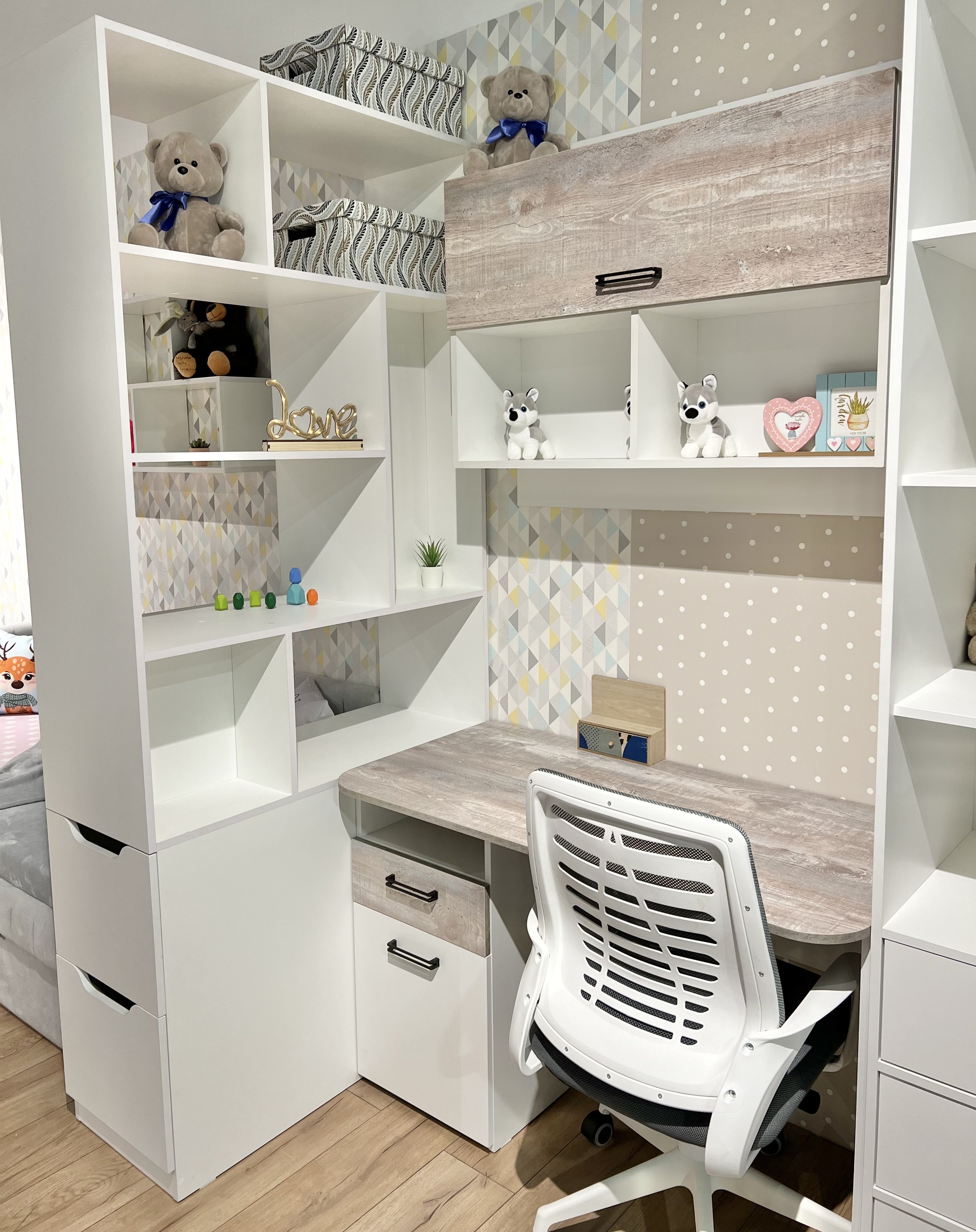 Мебель выполнена из сертифицированного, качественного, экологически чистого ЛДСП класса Е0,5 в сочетании цвета "бетон пайн" с белым.