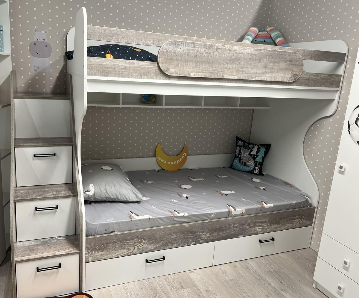 Двухъярусная кровать коллекции мебели Гранд с удобной, безопасной лестницей и комфортной высотой.