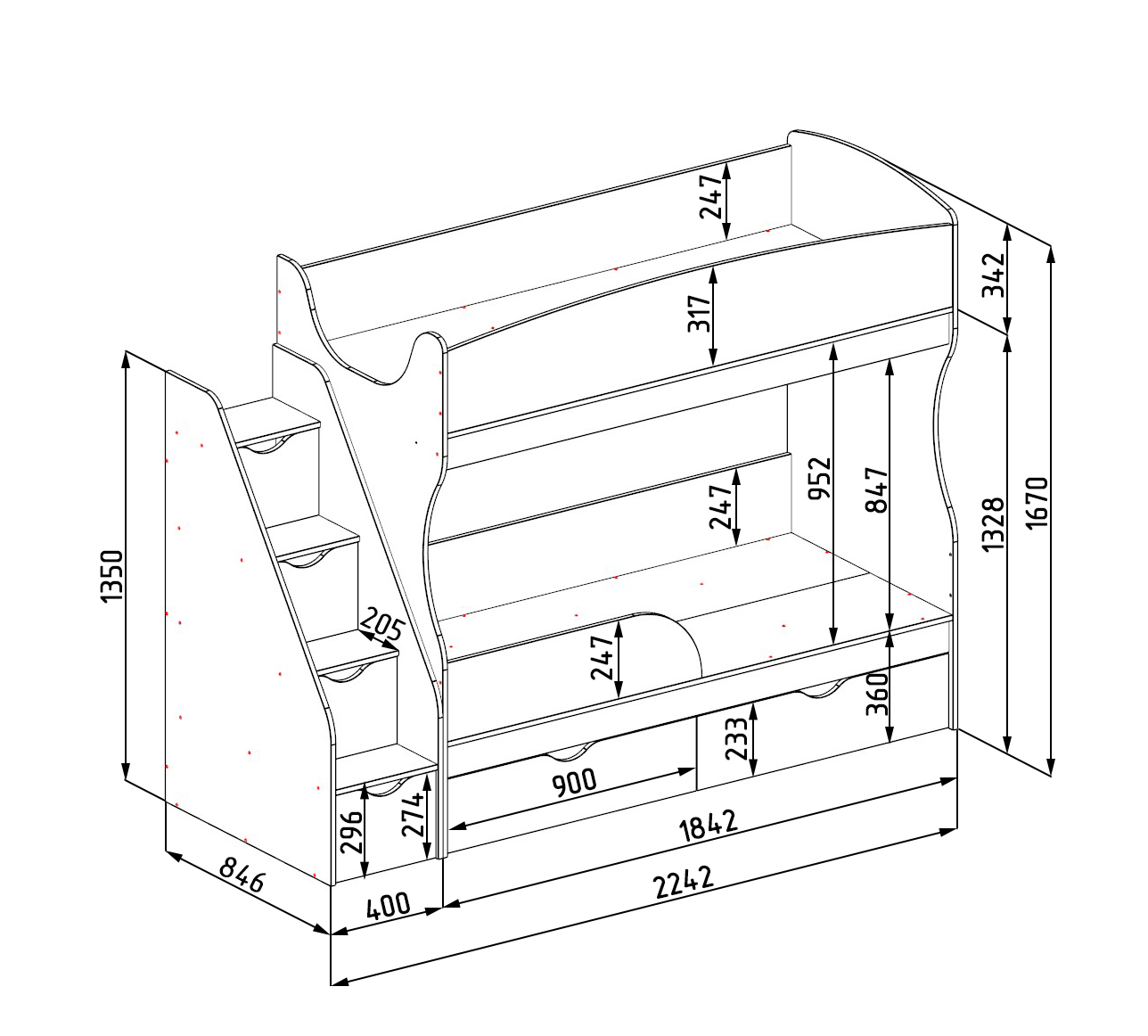 Габариты кровати: ширина с учетом лестницы 2242, глубина 846, высота 1670 мм