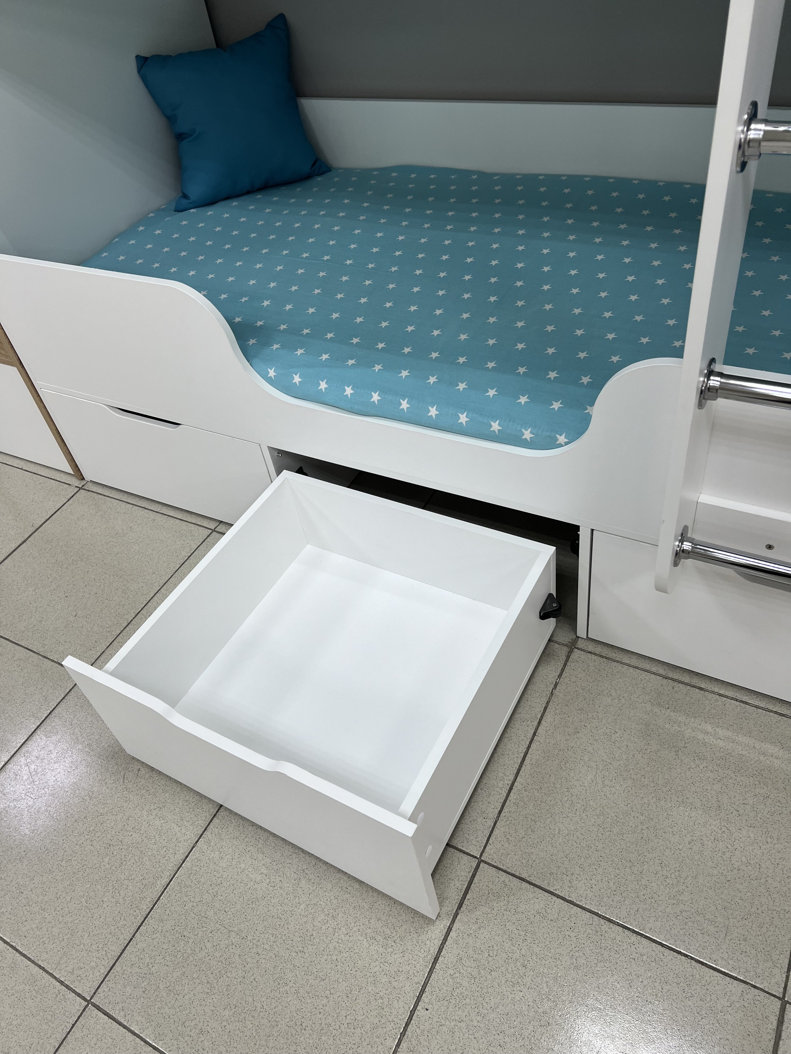 Вместо них - цельный и прочный настил из ЛДСП, который выдерживает сверхвысокую нагрузку и позволяет расположиться даже взрослому с ребенком.
