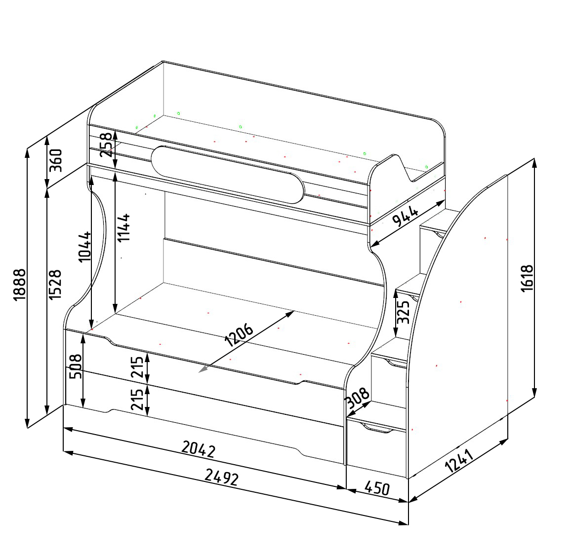 ширина с учетом лестницы 2493, глубина 1241, высота 1922 мм