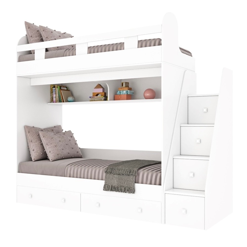 спальное место для двоих, навесная полка для книг и игрушек, вместительные выдвижные ящики под кроватью, а также безопасная лестница, обеспечивающая быстрый и удобный доступ на второй этаж.
