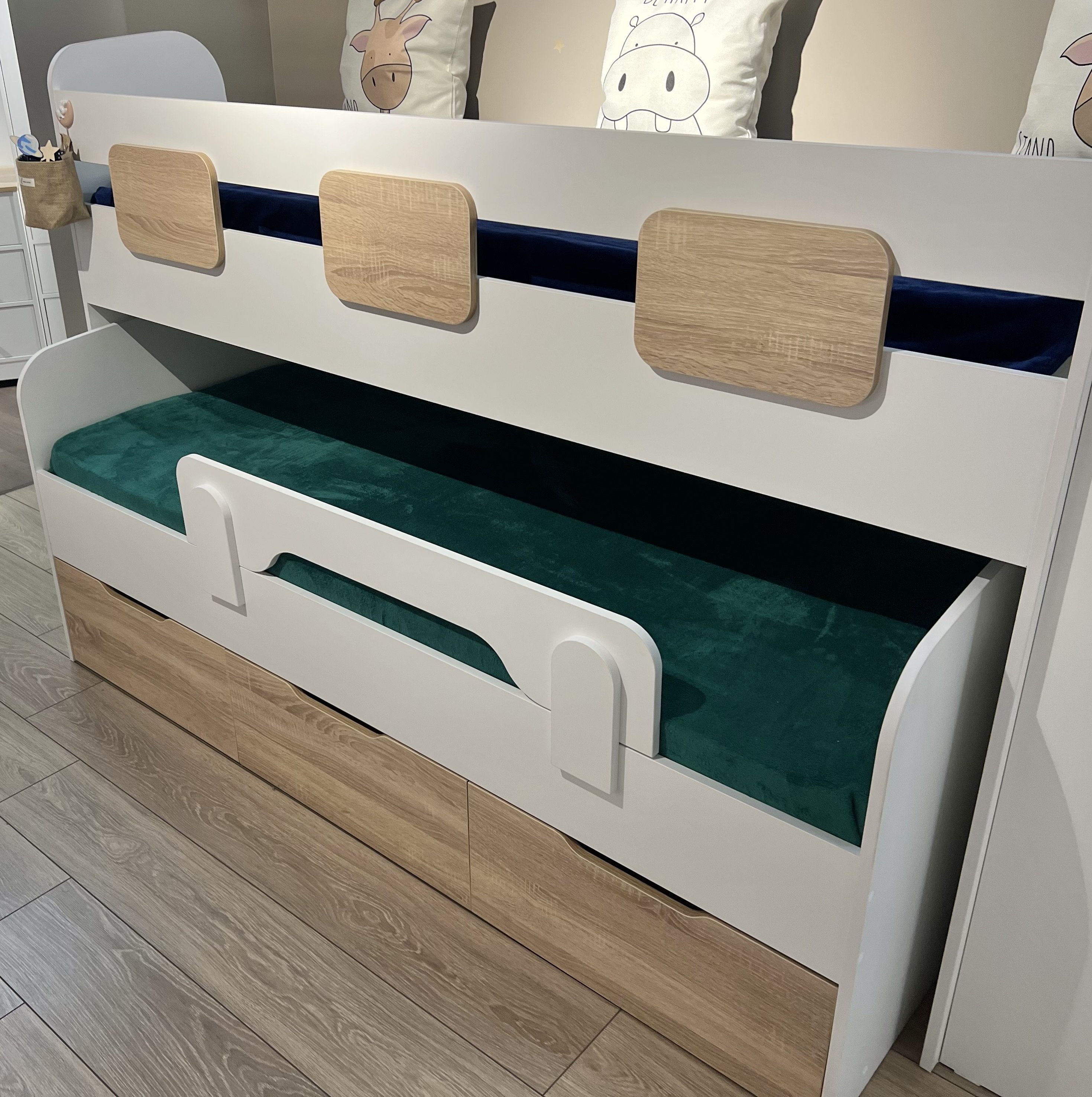 * Нижняя кровать выдвигается полностью благодаря колесным опорам.