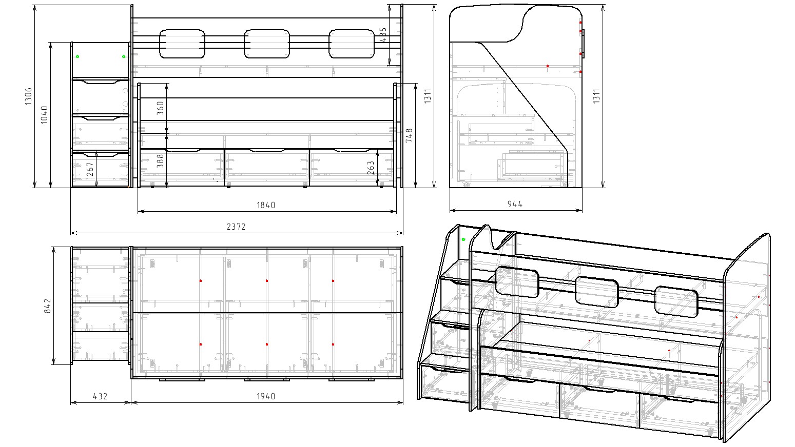 Габариты кровати: ширина 2372, высота 1311, глубина 958 мм