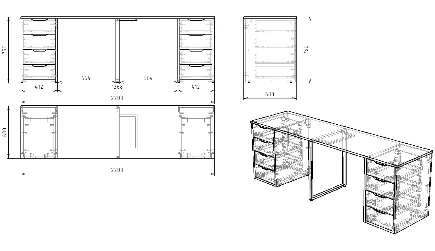 Доводчики, направляющие скрытого монтажа. Столешница и корпус тумб 22 мм. Дно ящиков прочное - выполнено из ЛДСП 16 мм (не ДВП!)