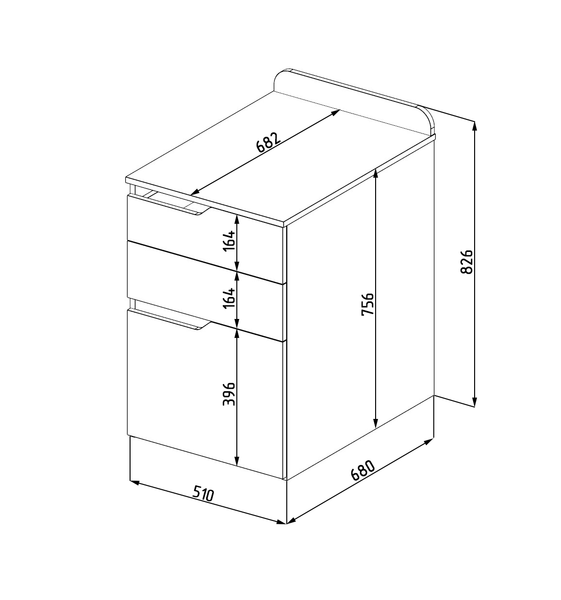 Габариты тумбы: ширина 510, общая высота 826, глубина 682 мм