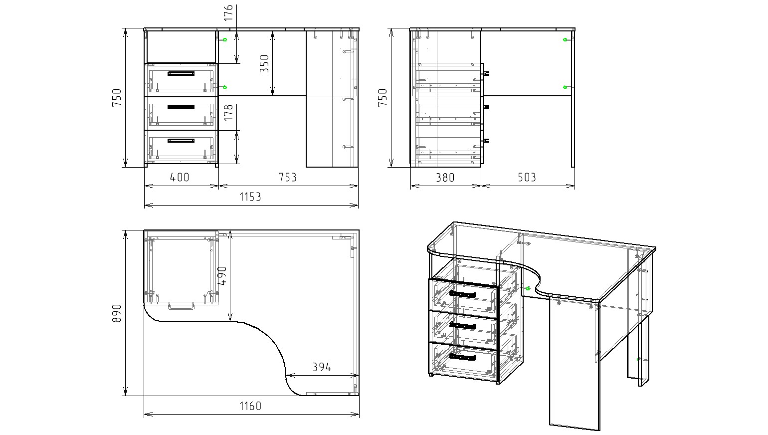 Габариты стола: ширина 1160 х высота 750 х глубина 890 мм