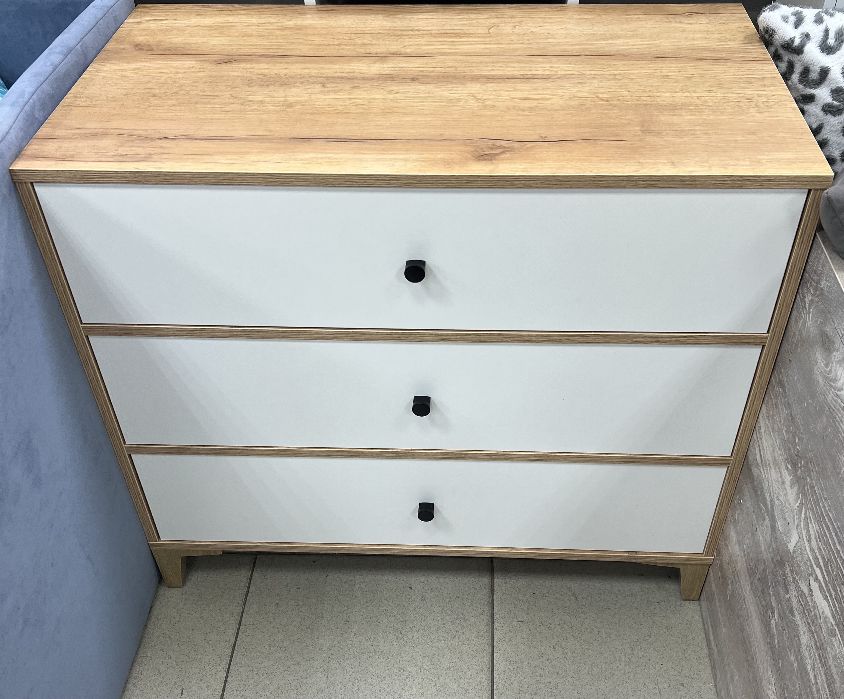 В комод встроены три выдвижных ящика на направляющих скрытого монтажа с доводчиками.