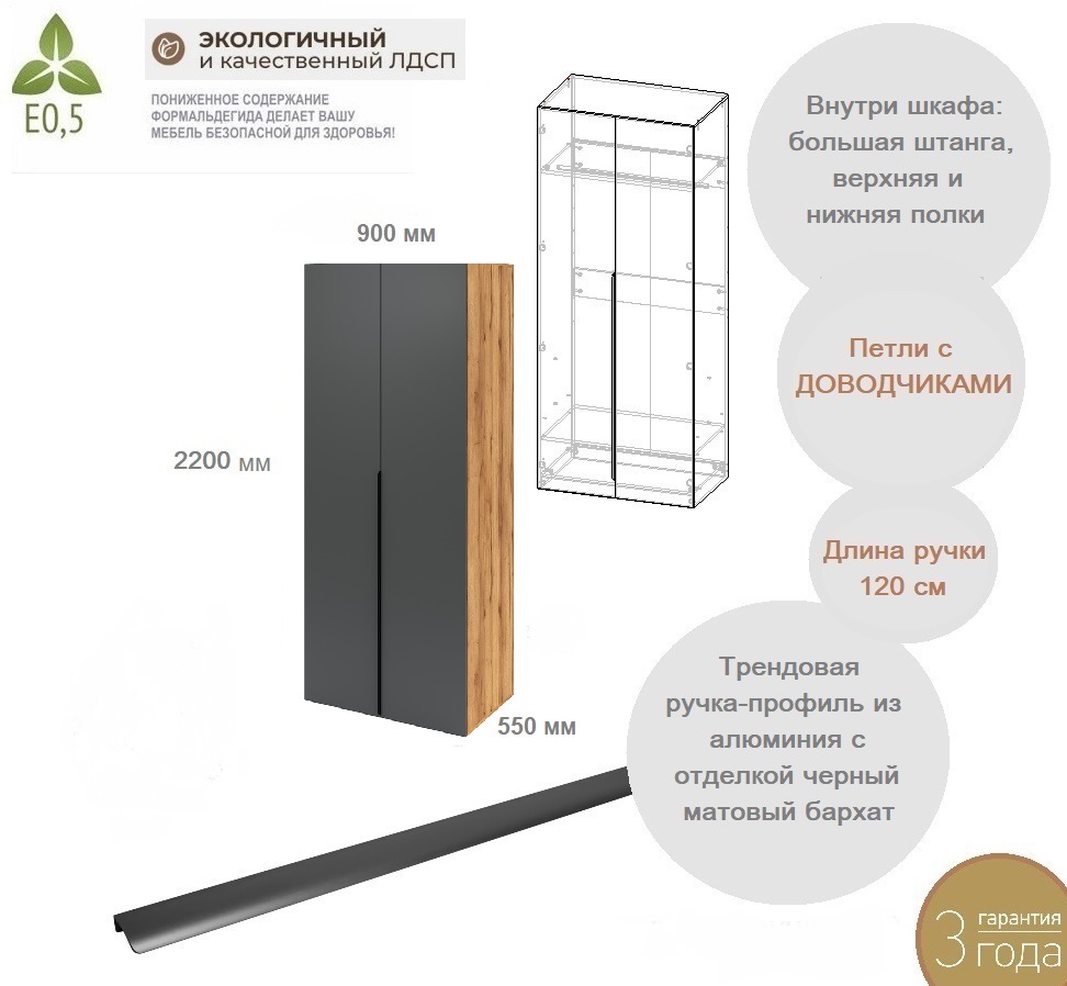 ЛДСП Е0,5. Толщина 16 мм. Доступна в цветах: корпус белый + фасады графит, корпус белый + фасады дуб золотистый, корпус дуб золотистый + фасады графит, полностью белый или полностью велюр |