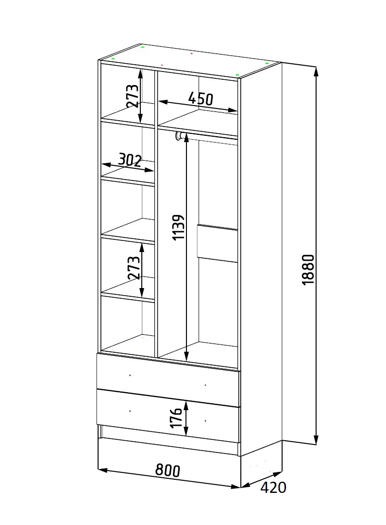 Габариты: высота 1880 х ширина 800 х глубина 420 мм