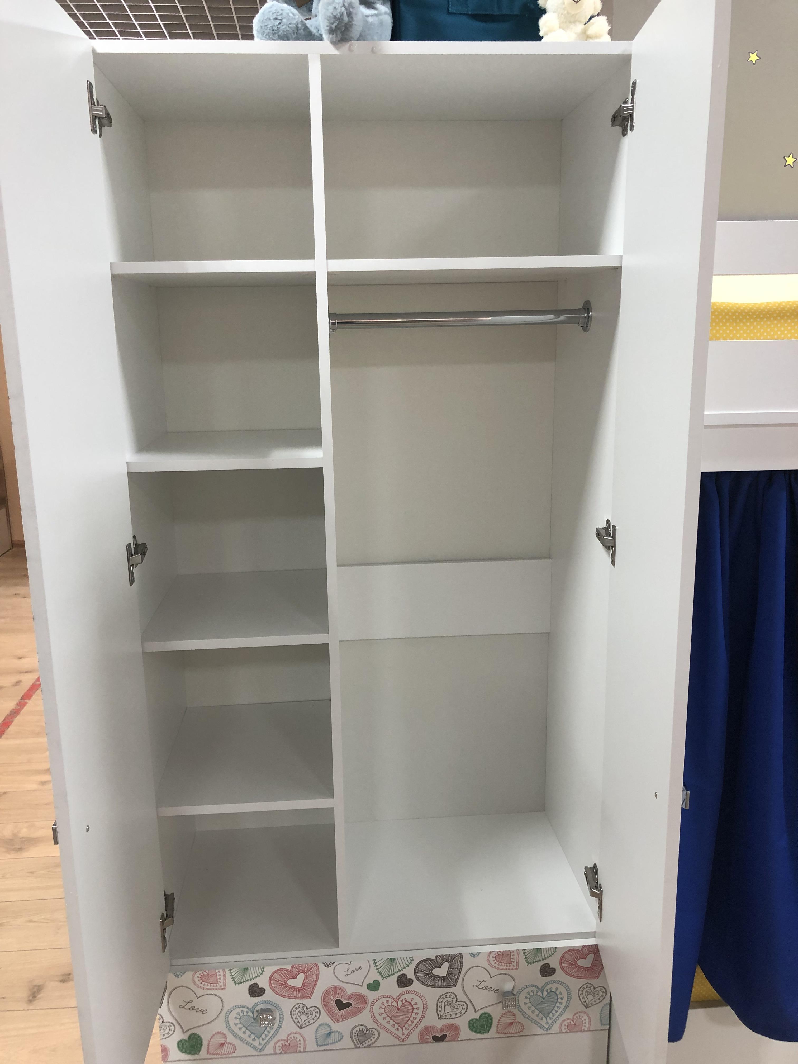 Внутри шкафа имеются штанга для вещей и дополнительные полки.