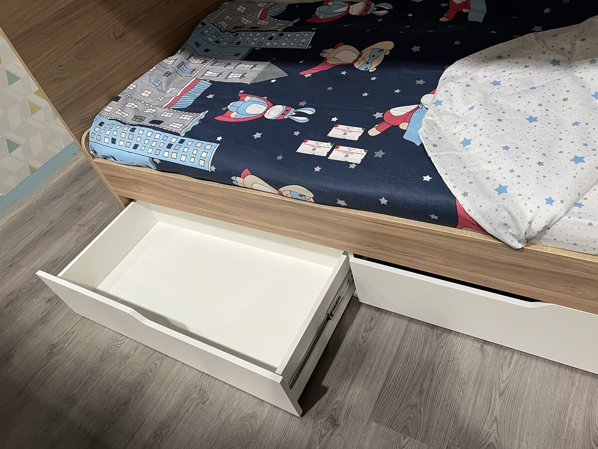 * В кровать встроены два выдвижных ящика на шариковых направляющих полного выдвижения.