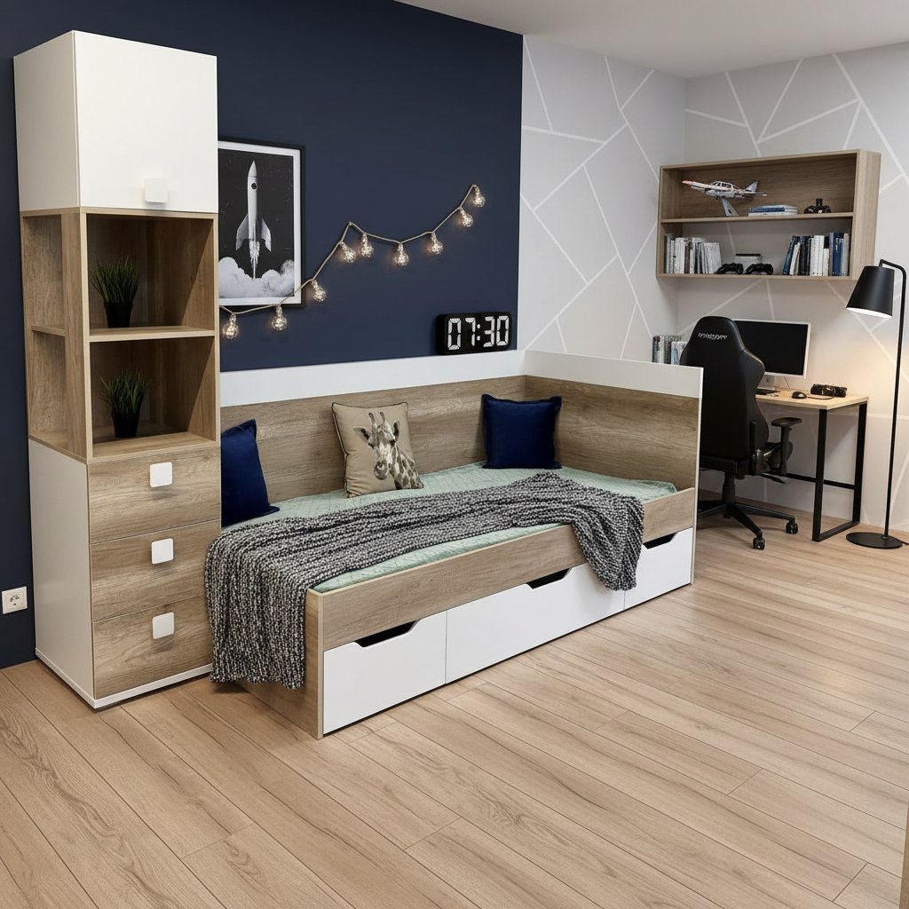 Мебель изготовлена из сертифицированного, качественного, экологически чистого ЛДСП класса Е0,5 в сочетании цветов дуб каньон с белым.