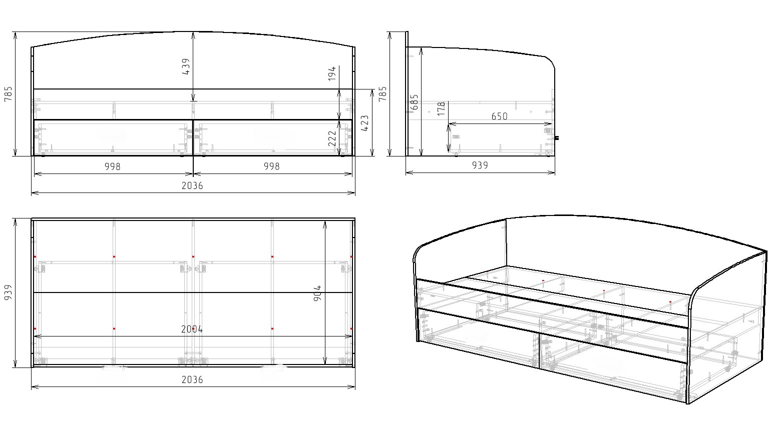 Габариты кровати: ширина 2036 х высота 785 х глубина 939 мм