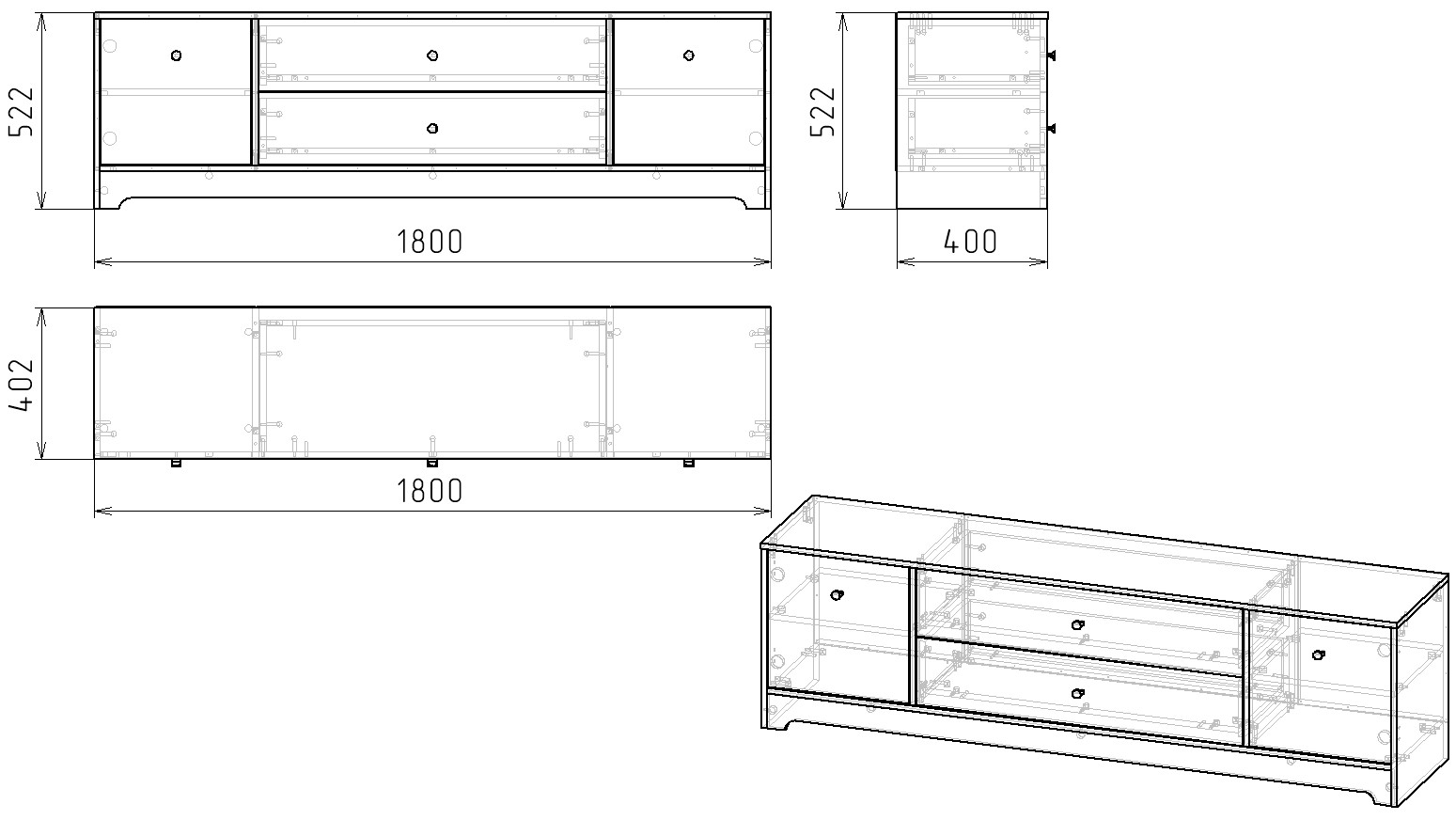 Габариты тумбы: ширина 1800, глубина 402, высота 522 мм