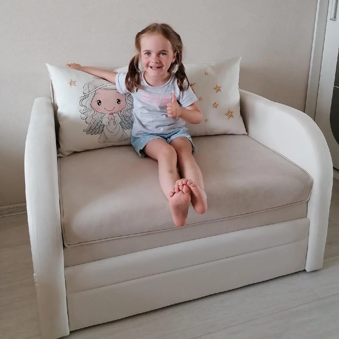 Диван полностью безопасен для ребенка, так как имеет прочную конструкцию и мягкие овальные подлокотники, которые защитят ребенка от травм.