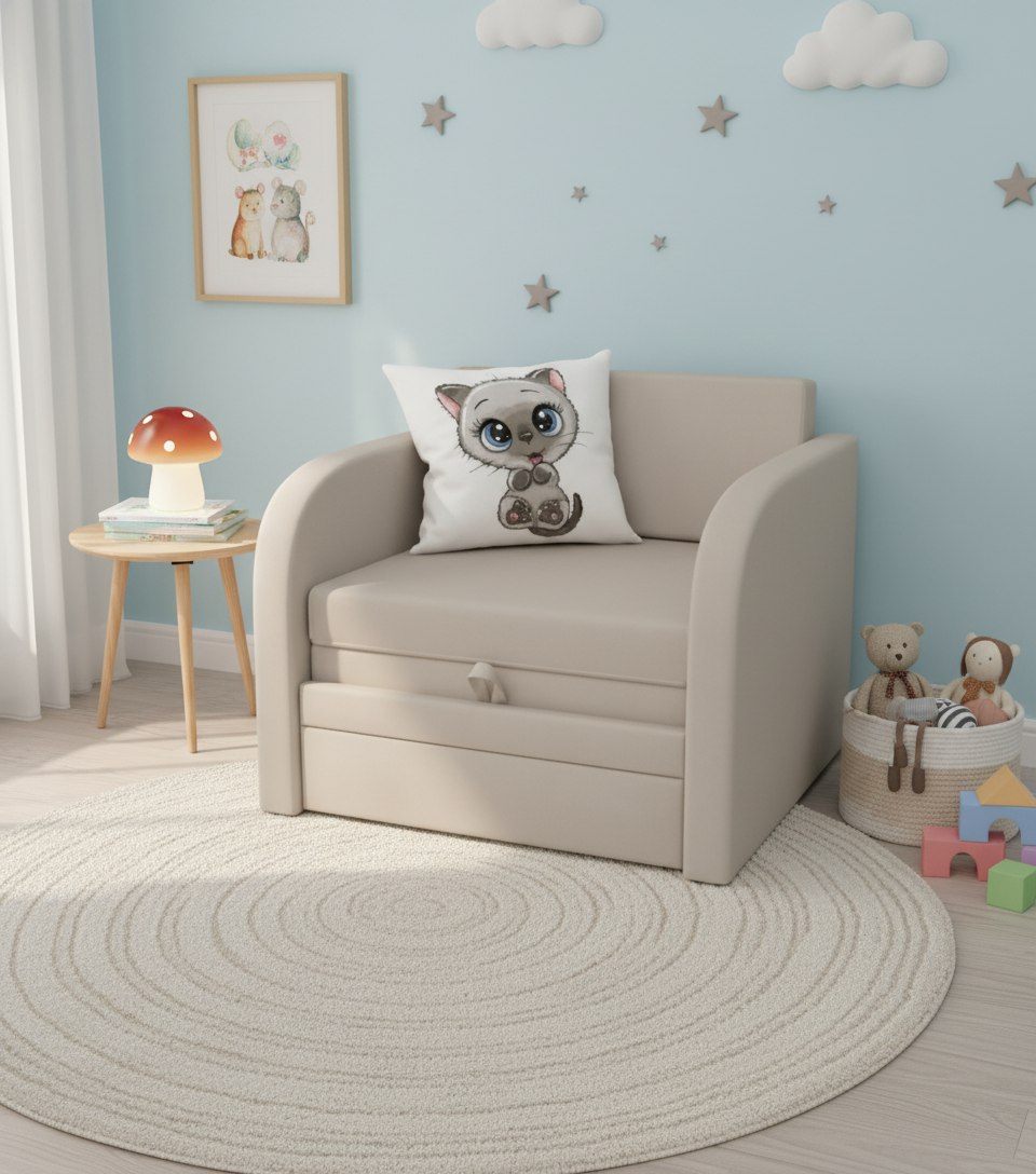 Диван полностью безопасен для ребенка, так как имеет прочную конструкцию и мягкие овальные подлокотники, которые защитят ребенка от травм.