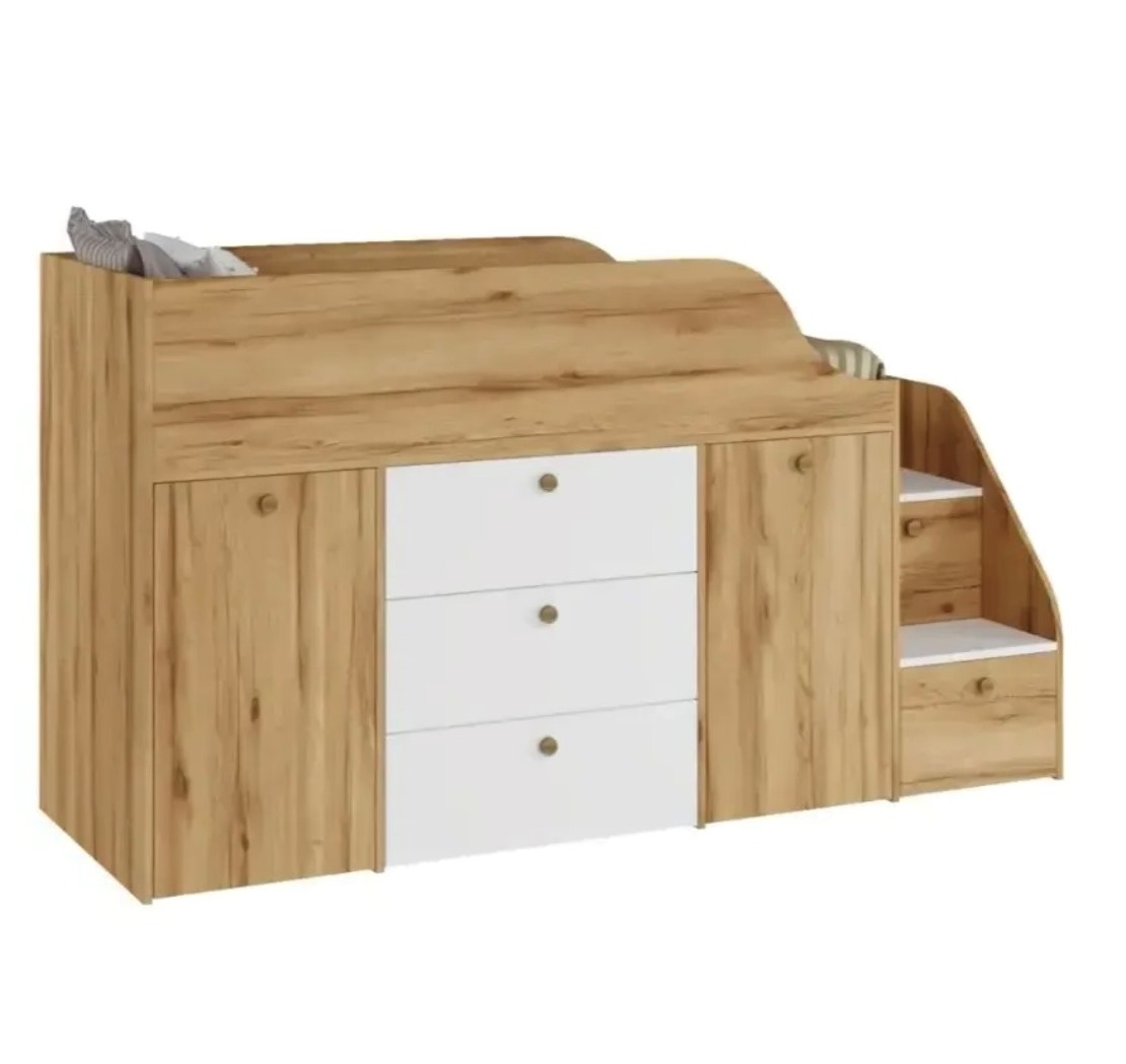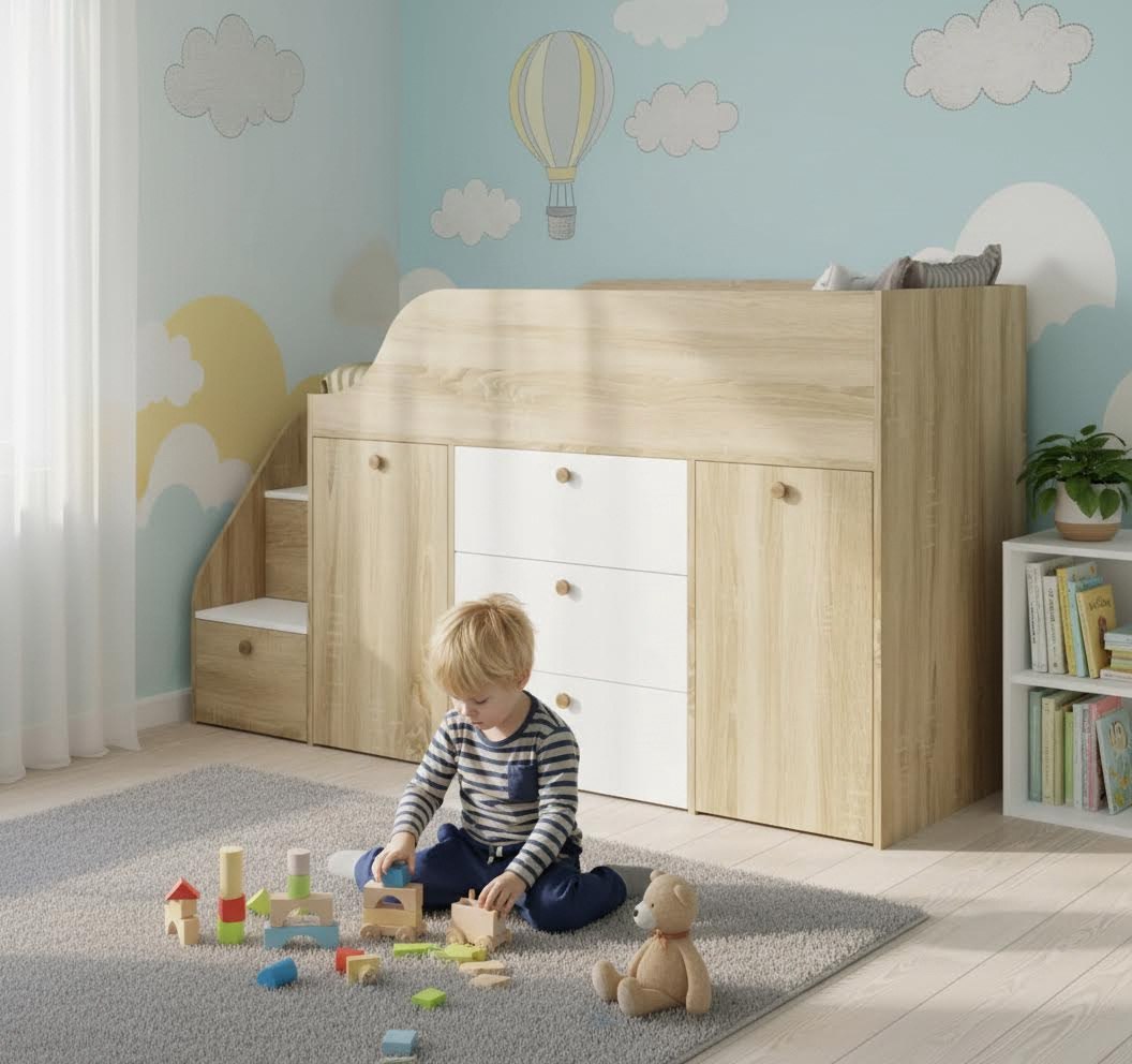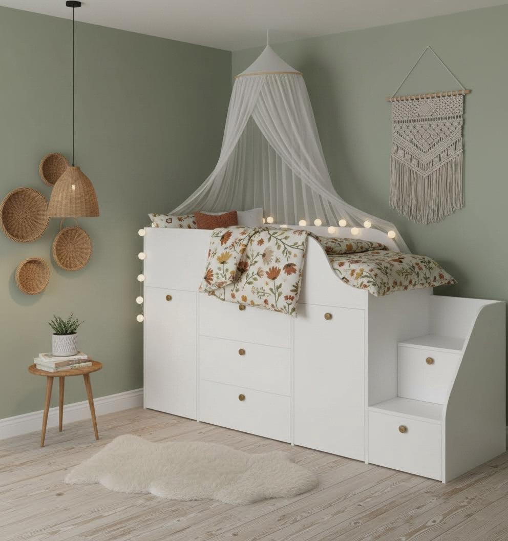 Функциональная кровать с удобной лестницей и множеством мест для хранения детских вещей.