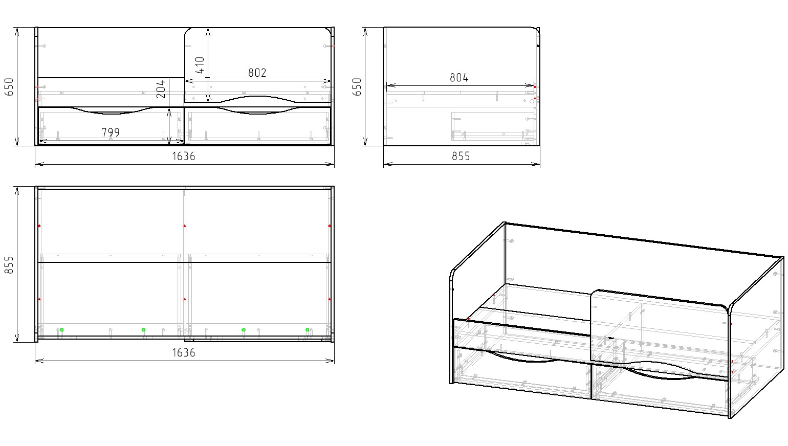 Габариты кровати: ширина 1636, высота 650, глубина 855 мм