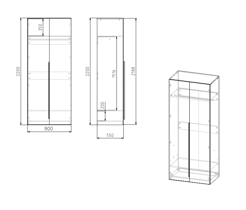 ширина 900 х высота 2200 х глубина 550 мм