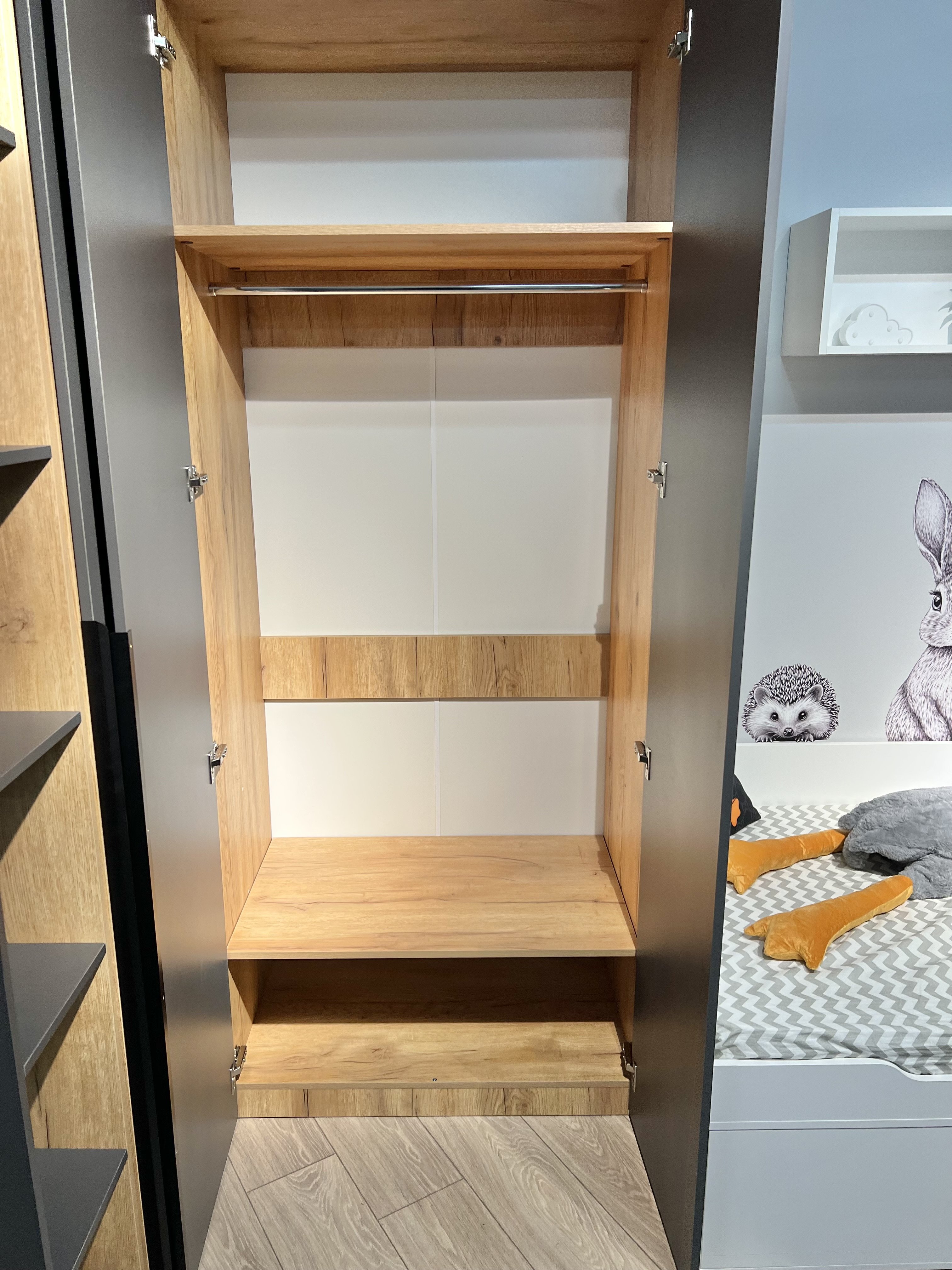 Внутри шкафа расположены большая штанга, верхняя и нижняя полки.