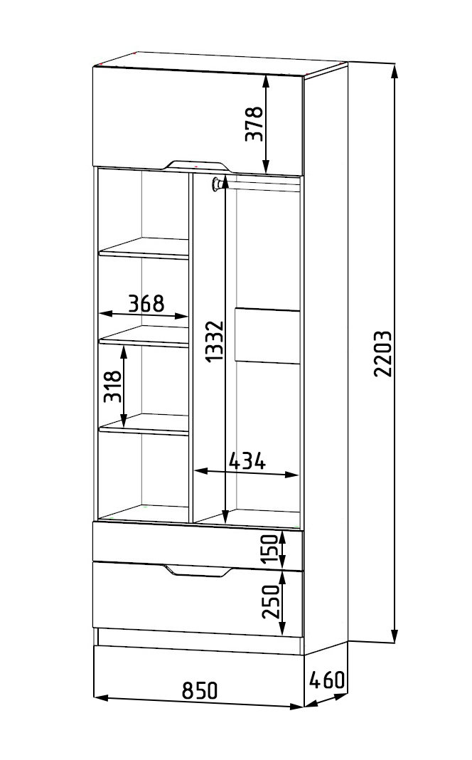 Габариты: ширина 850 х высота 2203 х глубина 479 мм