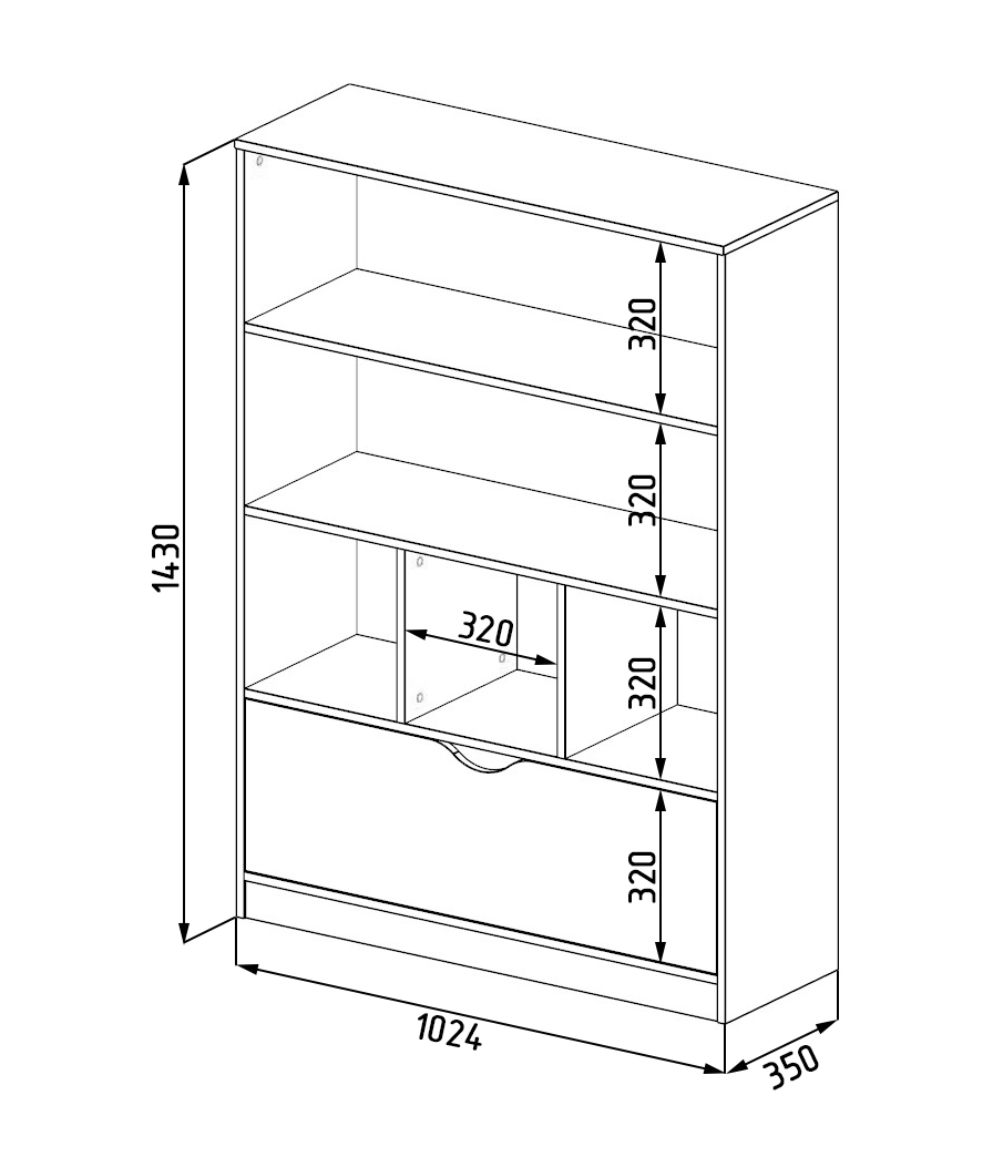 Габариты стеллажа: высота 1414, глубина 350, ширина 1024 мм