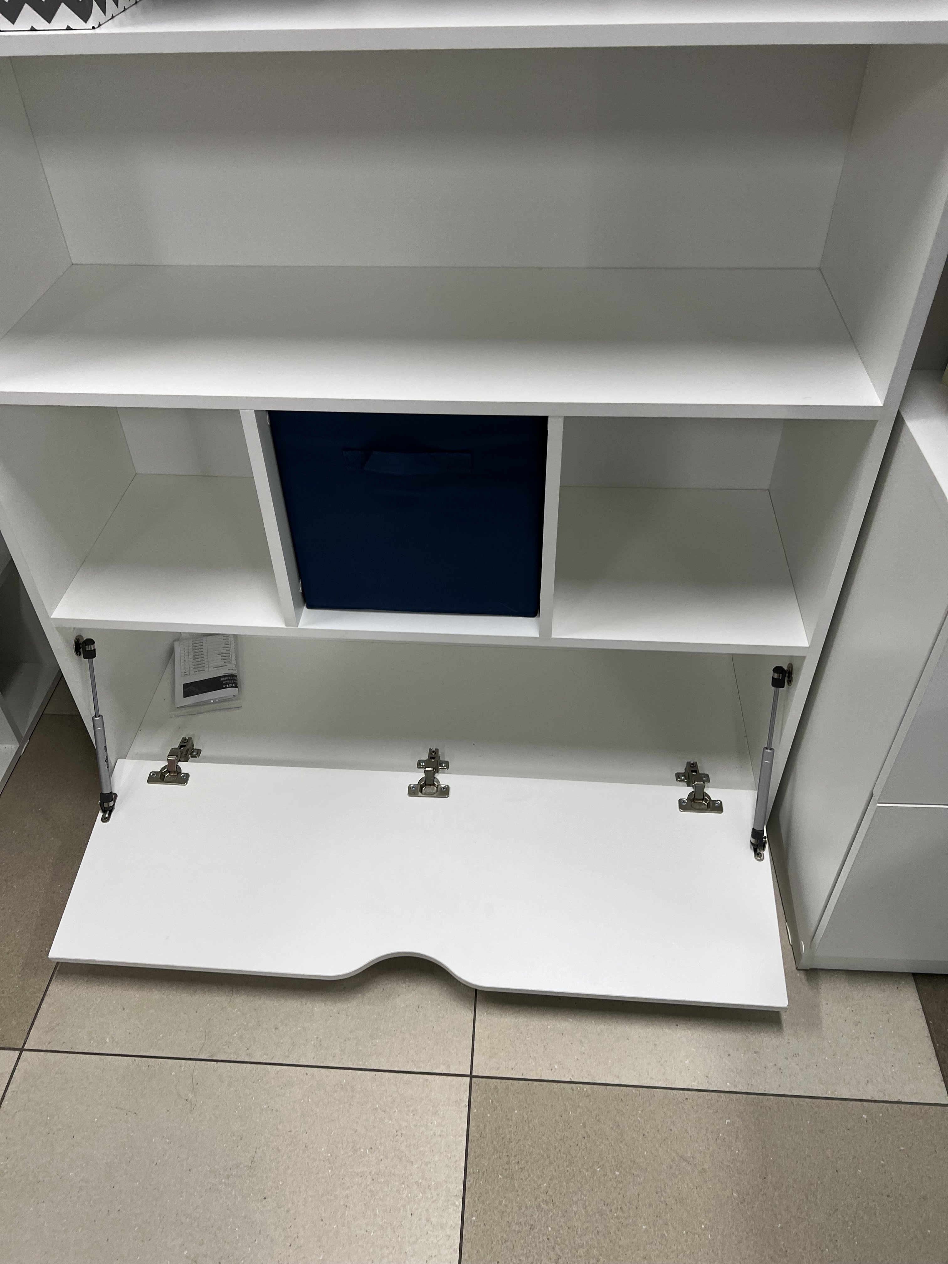 Дверка стеллажа открывается вниз.